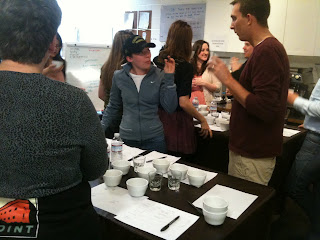 My partner and I stepped into the inner sanctum of Temple Coffee & Tea in Sacramento where a quiet ritual was about to take place: a Tea Processing and Tasting class. Several tall tables with cups of labeled tea leaves, water, cup placement mats and note paper stood at the ready. The din from the outer cafĂ© faded as the ten initiates waited to hear the word from our tea guide Leslie Fraser. “It’s time. Let’s start.”